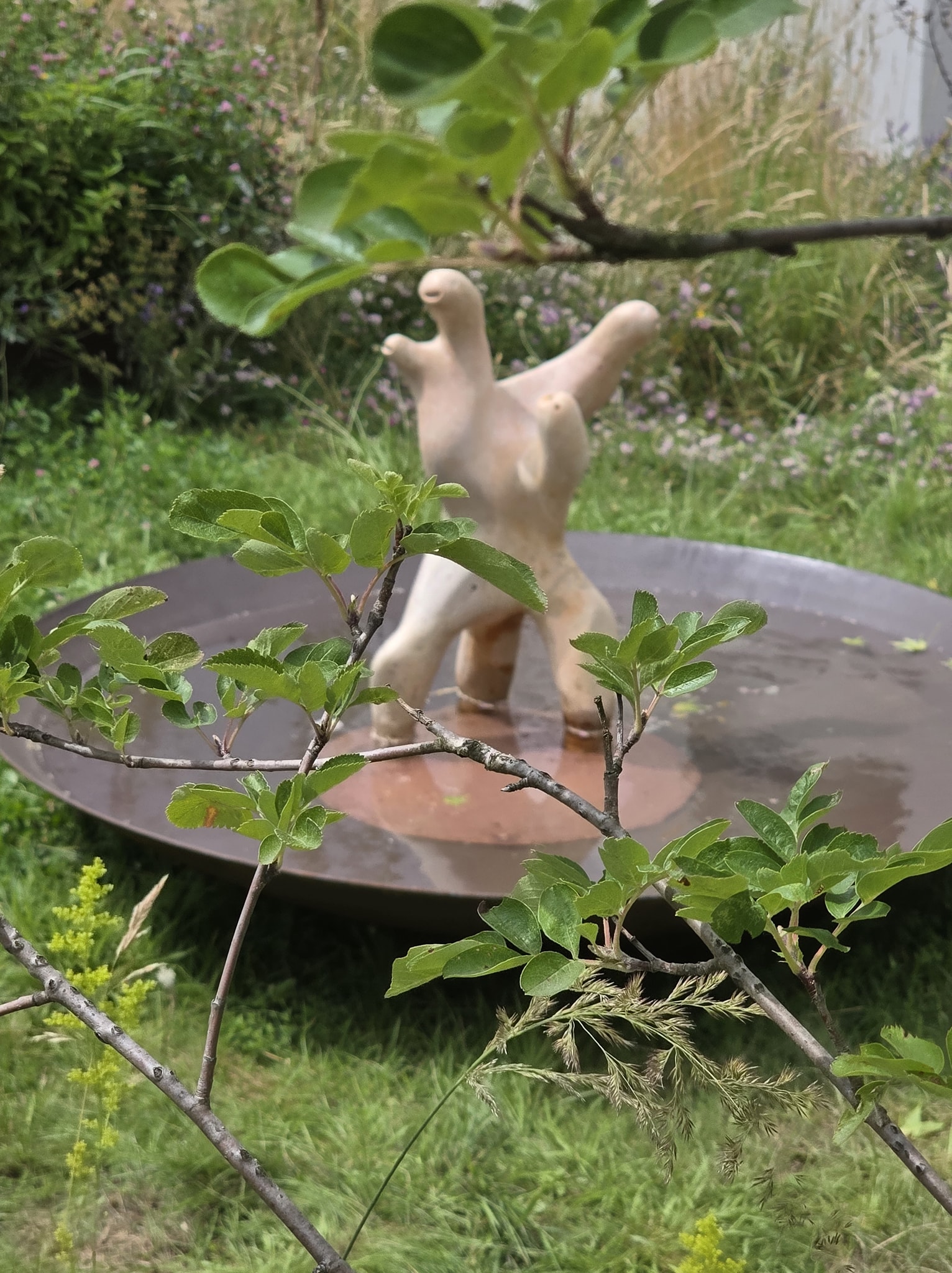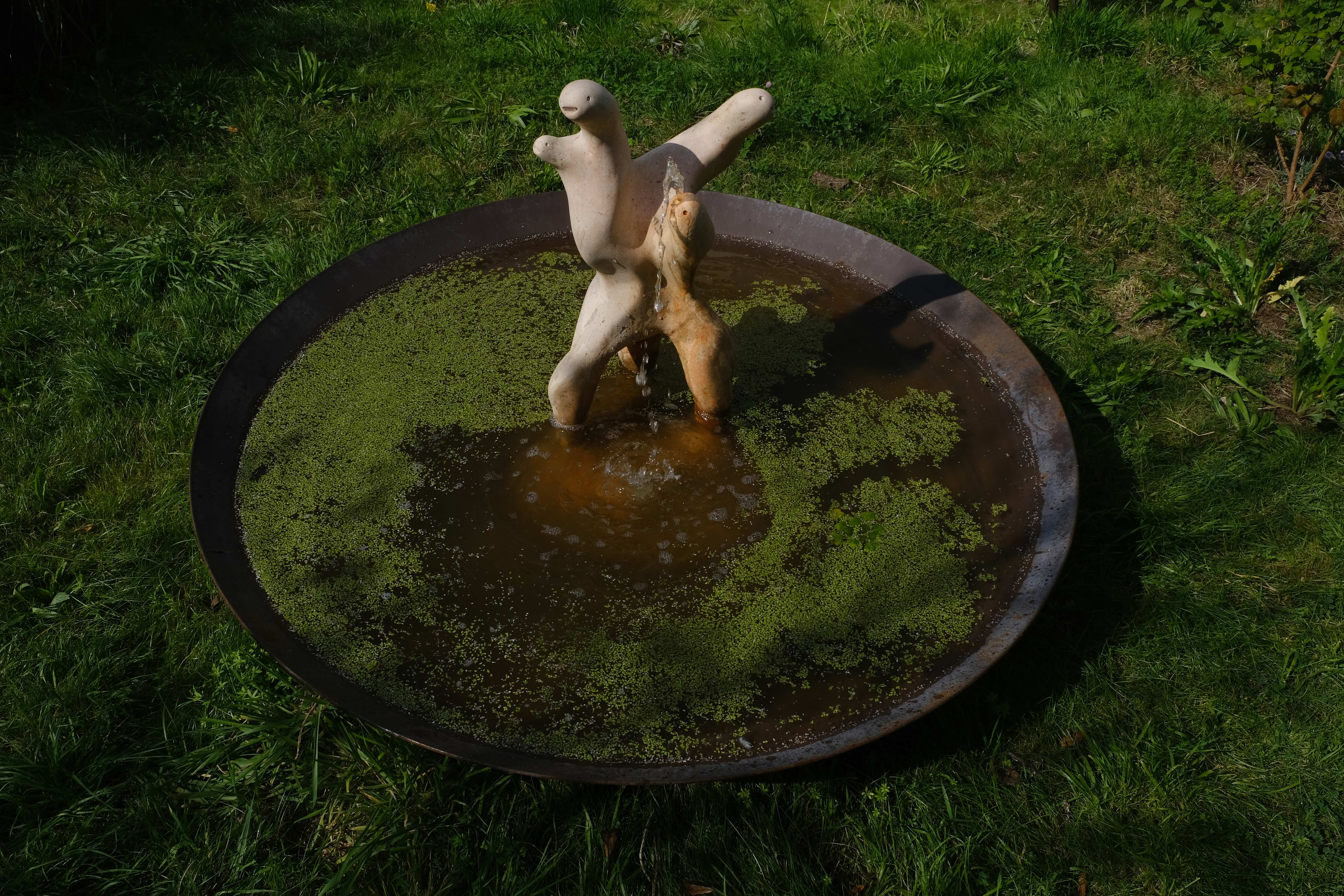Motywem wcześniejszych prac artystki był nieustanny przepływ materii, którego źródło biło w wodzie. Ceramiczne modele rzeźbionych fontann w przestrzeni publicznej tryskają strumieniami zdolnymi podmywać organikę struktur. „Choć wszyscy jesteśmy ciałami z wody, przeciekamy i przesączamy się nawzajem, to nie pozwalamy się całkowicie rozpuścić, unicestwić materialnie. Albo raczej odkładamy ten moment: z prochu powstałeś, w proch się obrócisz, z wody powstałeś, w wodę się obrócisz” [5]. Modele proponowanych przez Brzeżańską fontann podtrzymywały także ekrany smartfonów. „Uszczuplenie bioróżnorodności przez cywilizację techniczną oznacza także uszczuplenie języka. (…) Kiedy coraz to nowe tamy zagłuszają chlupoczącą mowę rzek, a dzikie głosy ziemi skazywane są na niebyt, nasze własne języki także ubożeją i tracą wagę, stając się coraz mniej doniosłe” [6].