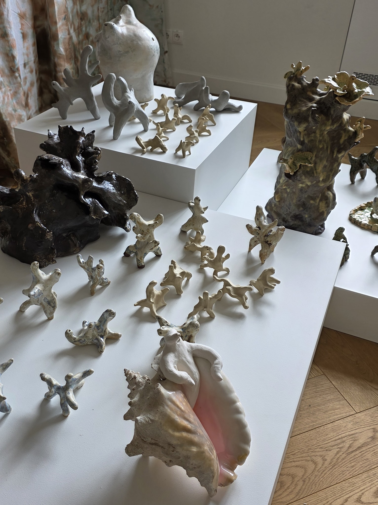 Przodki, amebowate w kształcie stworki, artystka nazywa „myślokształtami”. Półabstrakcyjne obiekty kojarzą się z organicznymi formami, które mają kończyny, a nawet mimikę.