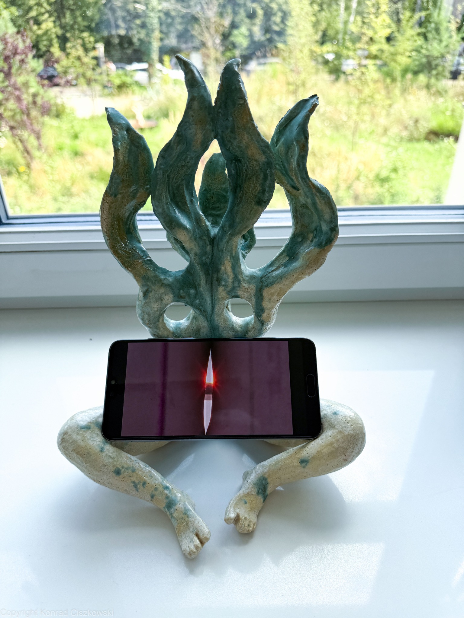 Bezładne formy-myśli, tajemniczo uśmiechnięte zjawy, a może reprezentacje natury, która — jak twierdzi Agnieszka Brzeżańska — jest z zasady przychylna wszystkim istotom? Ceramiczne rzeźby realizowane przez artystkę w ostatnich latach wydają się ujmować formalnie i semantycznie jej zainteresowania czy fascynacje. Symbolicznym elementem na wystawie staje się prezentowany w postaci instalacji zbiór obiektów przypominających kandelabry o organicznych kształtach (Metaphor of everything, 2017). Ustawione na lustrach, wyposażone w świece zapalane podczas zwiedzania, postaciorośliny potęgują polisensoryczny wymiar ekspozycji, zapraszając jednocześnie do bardziej intymnego kontaktu ze sztuką.