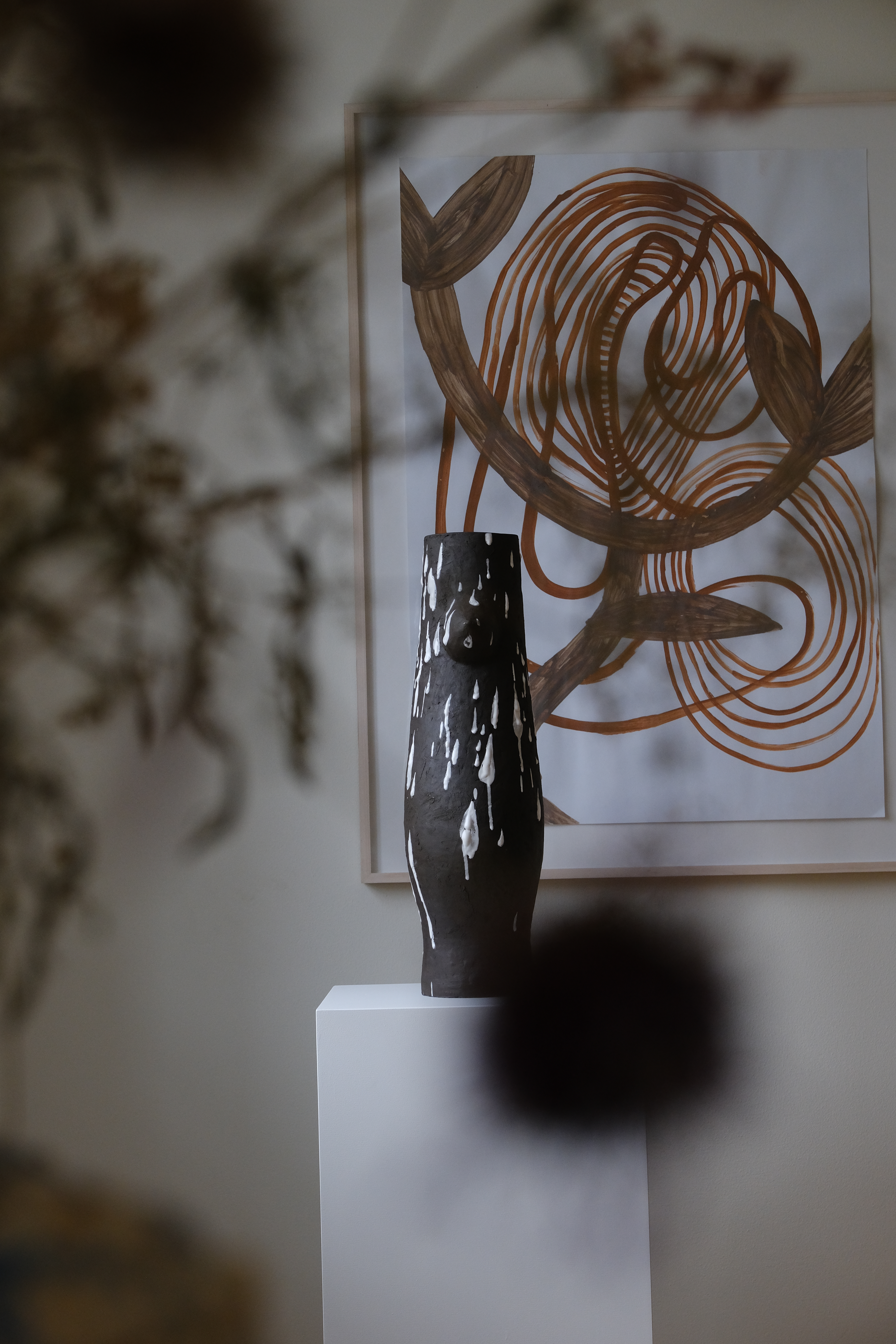W sztuce Brzeżańskiej wyraża się ufność wobec naturalnej samoregulacji organizmów. Artystka gołymi rękami pracuje w tym, co nazywamy pierwotną zupą [2], która wrze i mutuje od milionów lat, będąc ogniwem łączącym naszą glinę, farbę i wodę z wiedzą dawnych kultur. Brzeżańska tworzy na przykład ceramiczne wieka urn, których roślinne, ornamentalne formy odwracają język formalny pradawnych naczyń do przechowywania ludzkich prochów. “Rośliny (…) grają ważną rolę w procesie rozmontowywania heteronormatywności, ponieważ myślenie z roślinami oznacza krytyczną refleksję nad wegetacją, posiadaniem i współpracą, płcią i organami płciowymi w kontekście człowieka i innych bytów” [3]. Granica między martwą materią wewnątrz urny i żywą na zewnątrz zaciera się. Okazuje się, że są ze sobą w kontakcie [4]. W niemal wszystkich kulturach świata wazy uważane są za nośnik opowieści i obrazów przodków. To często jedyne artystyczne świadectwa pozostałe po dawnych kulturach, ideach i historiach.
