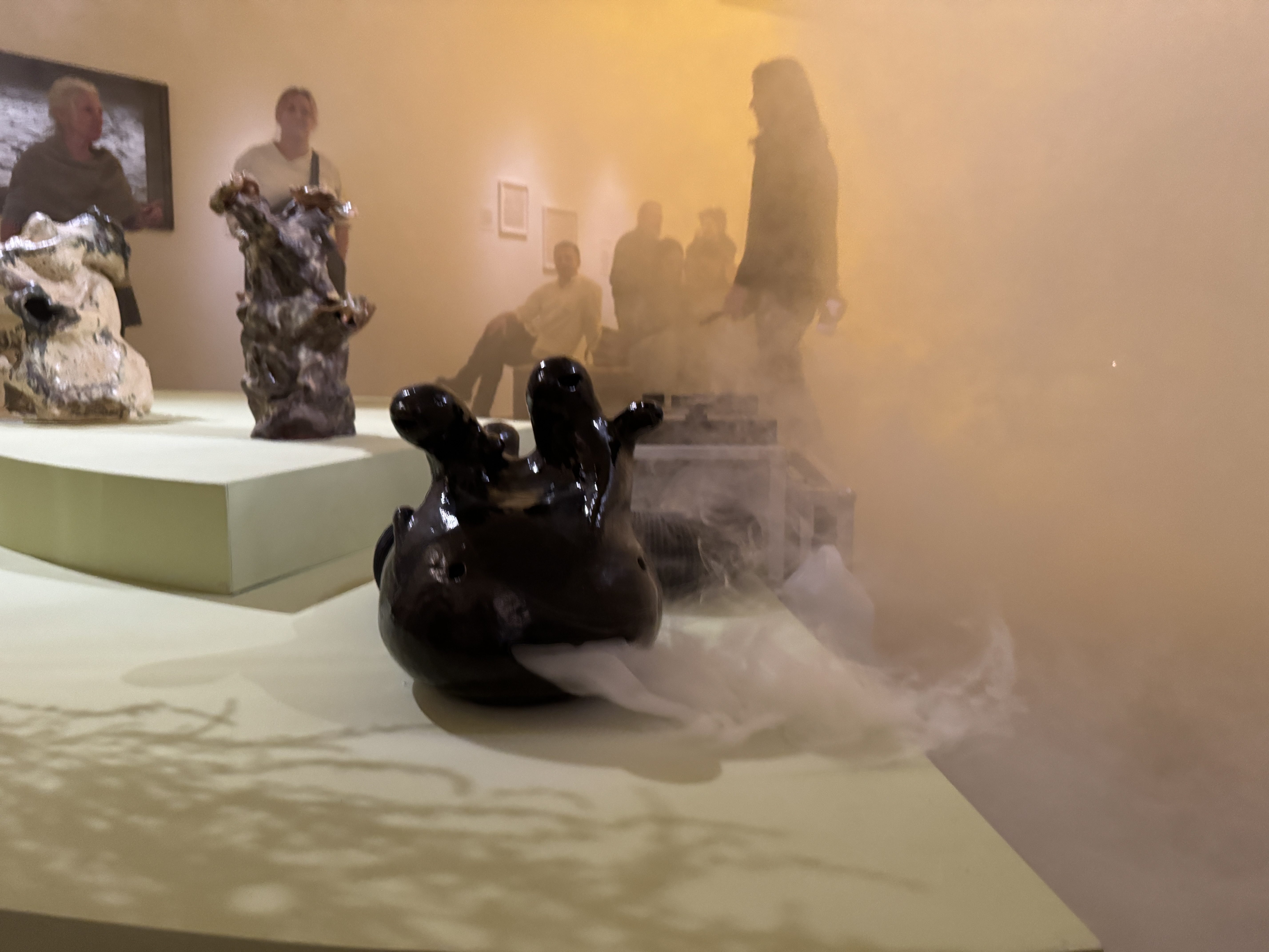 Takim płynnym językiem mówią obrazy Brzeżańskiej pokazane na wystawie. Materia nieożywiona, zwierzęta, mikroby przechodzą na jej płótnach metamorfozy, wchodzą ze sobą w interakcje, nie wiadomo czy symbiotyczne, demoniczne, czy może pasożytnicze. Ceramiczne stworki wielkości dłoni (herbaciane zwierzaki towarzyszące osobom w samotności parzącym herbatę) spoglądają na nas niewielkimi mordkami. Wyglądają jak powiększone mikroskopowe obrazy archeonów [7], ich węglowodorowych szkieletów zalegających przez setki lat na dnach oceanów. Uśmiechają się do nas: „Na szali leży historia ziemi, w której uczestniczymy. (…) Koniecznie musimy zyskać i dać sobie nawzajem możliwość zmiany tej historii, opowieści o nieustannym trwaniu, które przebiega w ziemi, w jej tunelach (…)” [8]. Organiczny przepływ ukazany na wystawie “Przodki” wygląda znajomo, bo bierze się z narracji i istot znacznie od nas starszych. Biomarkery pozwalają paleobiolożkom, biochemikom i archeolożkom poznać skład naszych pierwotnych, mikrobowych ekosystemów. Przywodzi mi to na myśl drobne cząsteczki natury i kultury, którymi oddychamy. Może kształtują nas bardziej niż nasze pochodzenie, status, tożsamość. „Mówi się, że kultura zmienia nie tylko nasze umysły, ale także ciała, w których żyjemy” [9]. Symbiotyczne relacje, które nieustannie tkamy tworzą nierozerwalną sieć. „Słowa, które stały się ciałem, mięśnie i kości poruszane nadzieją i chęcią, wiara ucieleśniona w czynach krystalizujących naszą realność (…). A mapy źródła należy wciąż przerysowywać od nowa, wbrew wcześniejszym obawom” [10].